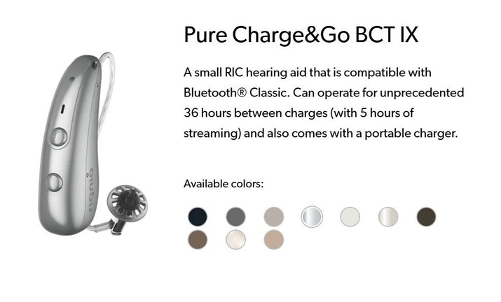 The Pure C&G BCT 7 IX combines smart hearing features with convenience. With rechargeable power, Bluetooth streaming, digital noise reduction, directional microphones, and multiple listening programs, these devices adapt to your lifestyle for effortless, all-day hearing.